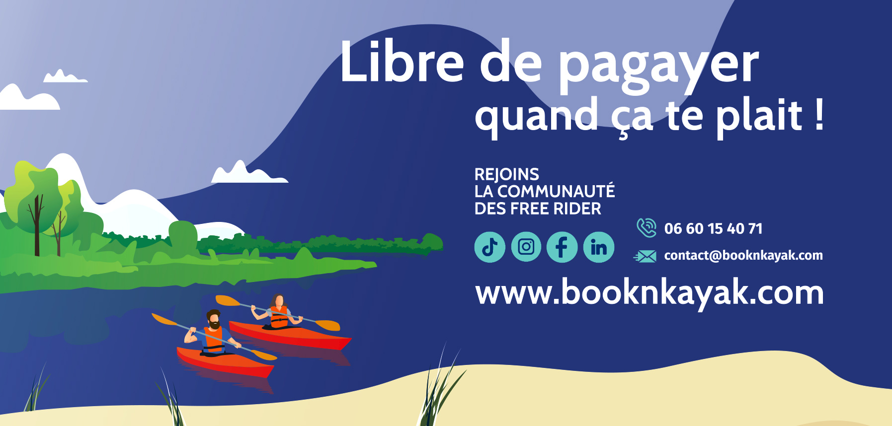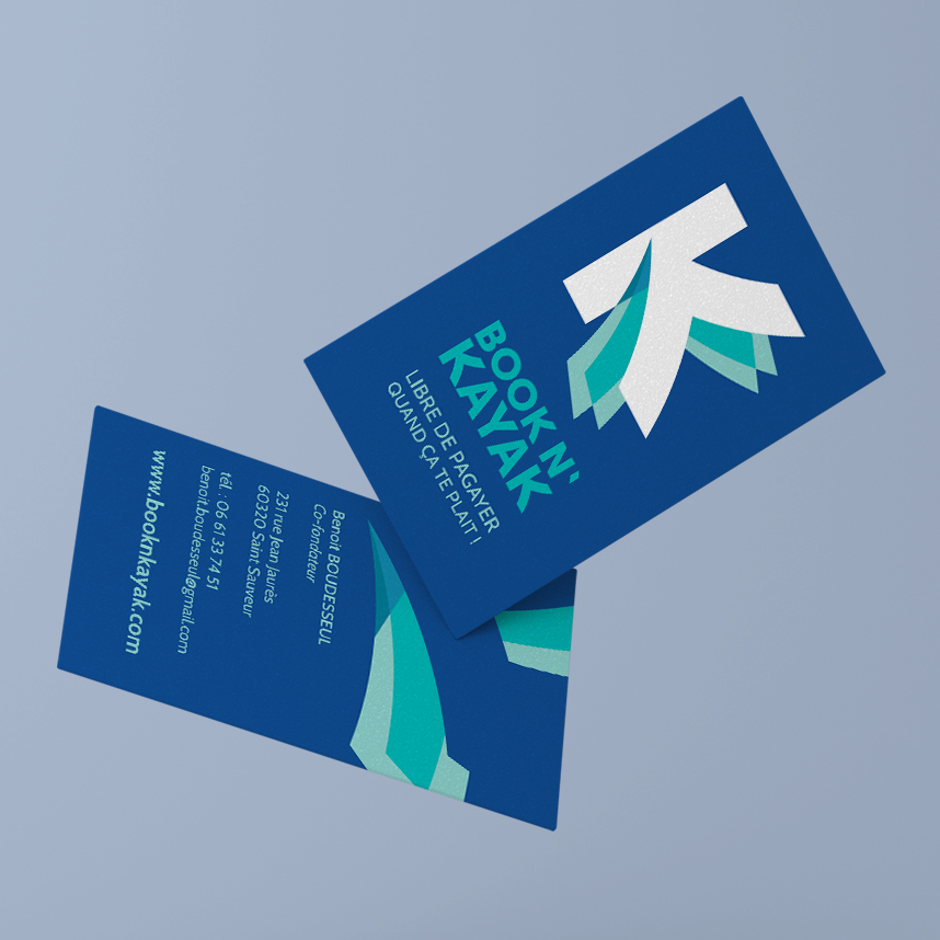 Pour accompagner le concept innovant de Bookn’Kayak — la location de kayaks autonomes, 24 h/24, directement accessibles via smartphone — nous avons imaginé une identité visuelle claire, fluide et énergique, à l’image de la liberté que propose la marque.